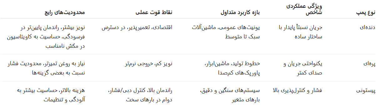 در عمل، دستههای اصلی پمپها با یک منطق مشترک مقایسه میشوند: «پایداری جریان»، «راندمان حجمی و مکانیکی»، «تحمل فشار»، «نویز»، «هزینه اولیه» و «حساسیت به کیفیت روغن». به همین دلیل، نگاه دستهبندی صرفاً آموزشی کافی نیست و بهتر است تصویر مقایسهای زیر را بهعنوان نقشه تصمیم در ذهن داشته باشید تا بدانید هر خانواده در چه نقطهای از طیف عملکرد میایستد.